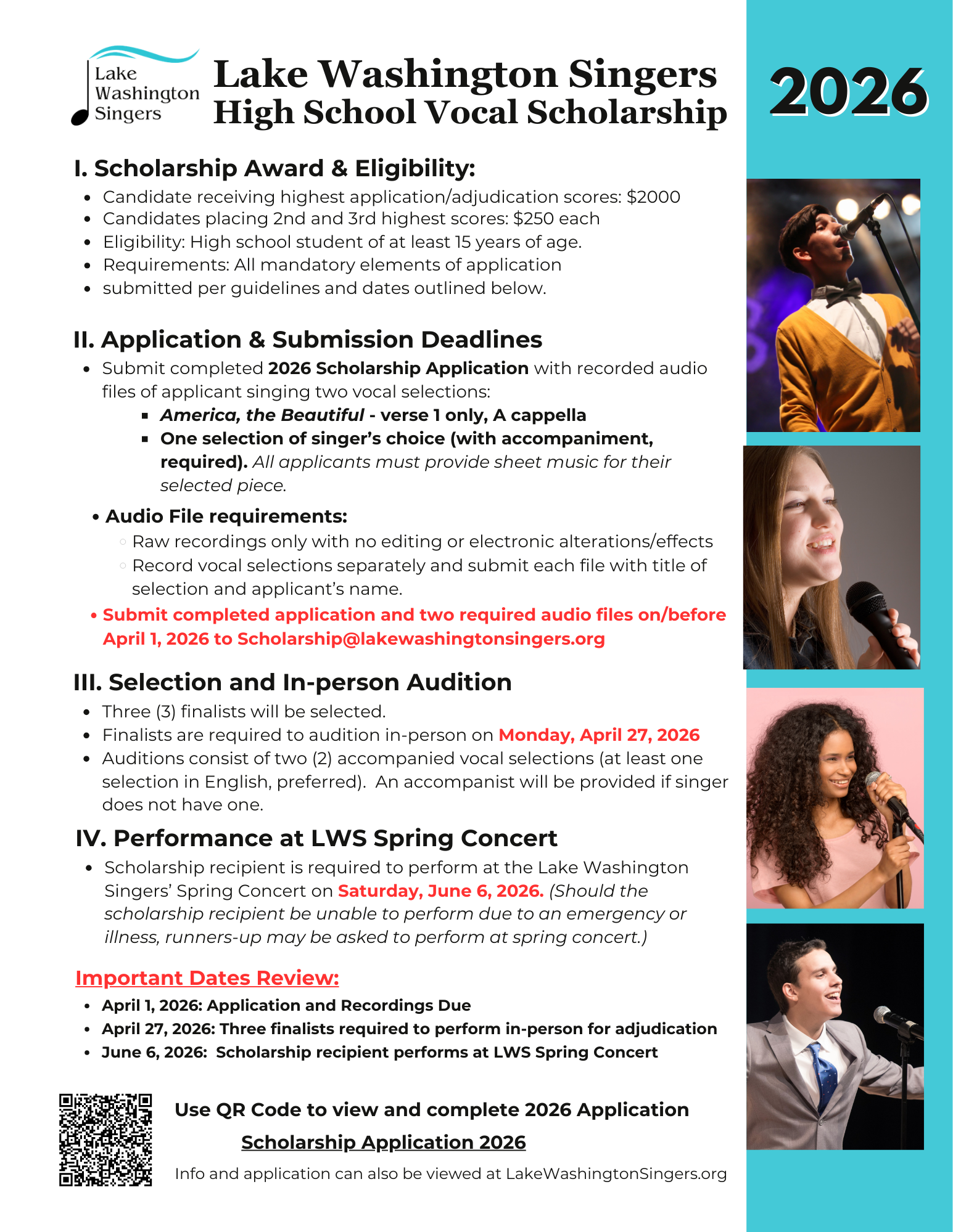 The Lake Washington Singers 2026 Scholarship is now open to submissions. All completed applications must be received by April 1. Please see additional details below.